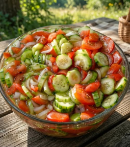 Built from fresh vegetables, creamy cheese, and a simple homemade dressing, this salad delivers balance in every bite—cool crunch, juicy freshness, and just enough richness to make it memorable.