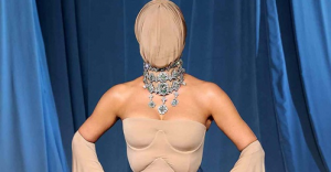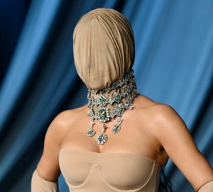 The 44-year-old reality star and fashion mogul arrived at the Academy Museum Gala in Los Angeles wearing a nude-toned Maison Margiela gown paired with an unexpected accessory — a skin-colored, balaclava-style mask that completely concealed her face.