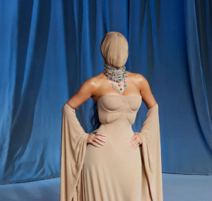 But this latest appearance felt different. Unlike her usual glam-heavy looks, the mask eliminated all facial features, leaving only the outline of her head visible.