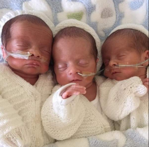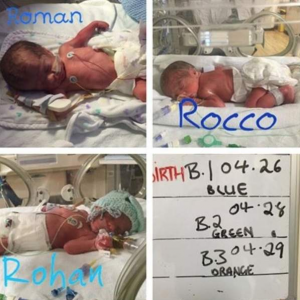 The three boys — Rohan, Roman, and Rocco — were delivered by Cesarean section at 31 weeks and each weighed just over three pounds. Because they arrived early, they spent their first weeks in neonatal intensive care, where doctors monitored their progress closely.